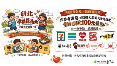 二、為照顧及保護18歲以下家遇急難學生,新北市府結合統一、全家、萊爾富及來來超商成立「幸福保衛站」,並與八方雲集、梁社漢排骨、鬍鬚張魯肉飯、劉家肉粽及石門區集馨村便當合作「好日子愛心大平台供餐計畫」,就讀新北市或設籍新北市學生遭逢變故,飢餓時可至超商及八方雲集、梁社漢排骨、鬍鬚張魯肉飯、劉家肉粽及石門區集馨村領取主食及飲料(或湯品)計新臺幣100元餐點,學生僅需填寫個人基本資料,由門店進行供餐及通報,後續由新北市府視個案情形關懷及協助。